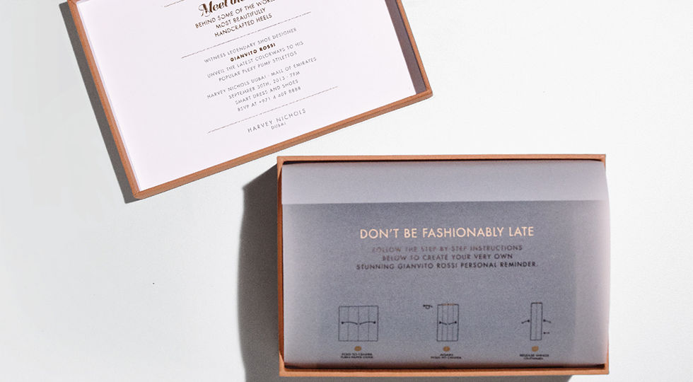 Concept: Gianvitto Rossi is famous for his handmade shoes and craftsmanship, so to invite Harvey Nichols’s big spenders to the opening of his new collection, we sent them a rather beautifully designed invite, which they could fashion by hand into a miniature version of one or other of the new collection's shoes.